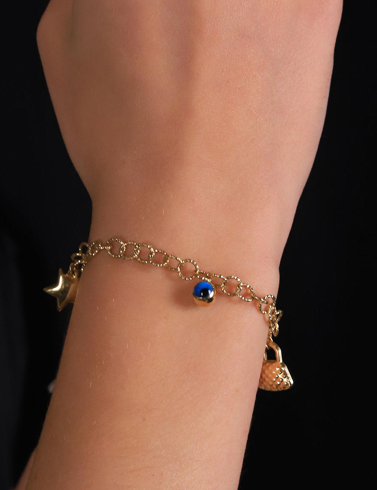 Kadın takı dünyasında özel bir yere sahip olan bu 14 ayar altından yapılmış halka zincir sallantılı bileklik, sade ama etkileyici tasarımıyla dikkat çekiyor. Yeşil renkli mavi boncuk detayı, klasik altın görünümüne canlı bir dokunuş katmaktadır.