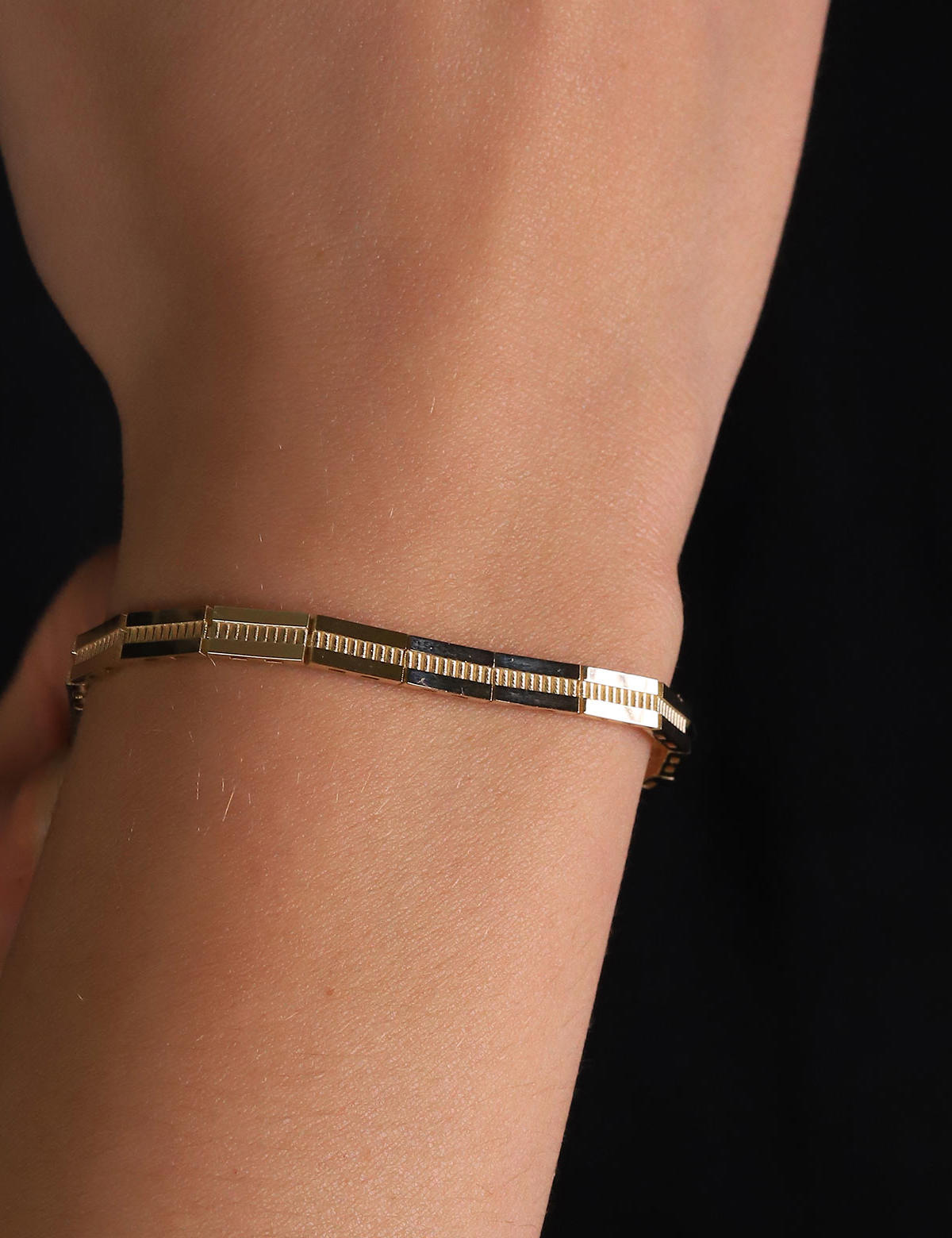 Klasik ama modern çizgilerle tasarlanan bu bileklik, taşsız yapısı ile sade bir güzellik sunarken, kanallı detayı sayesinde göz alıcı bir hâl alıyor. Günlük ya da özel gün kombinlerinizde kullanabileceğiniz mükemmel bir parça olarak ön plana çıkıyor.