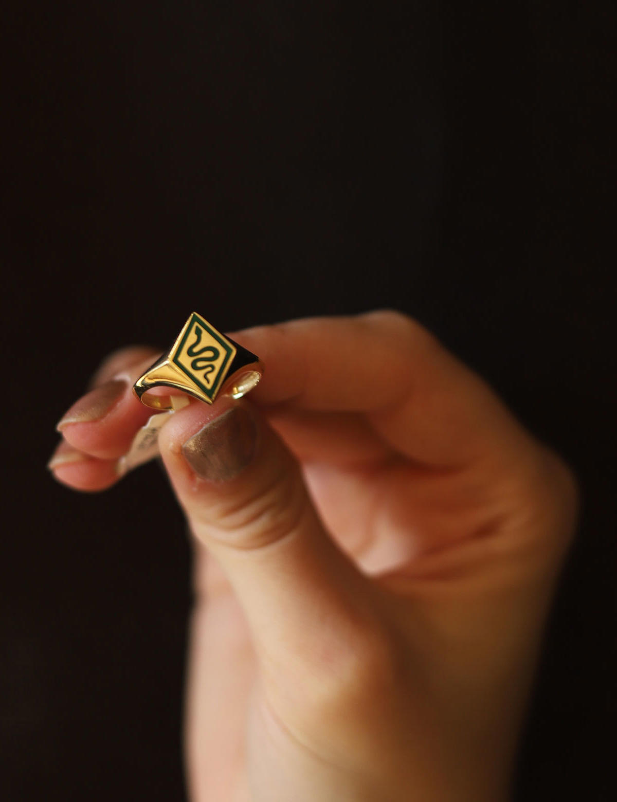 Doğanın en mistik sembollerinden biri olan yılan, altın yüzüğe hayat veriyor. Gülenler Altın güvencesiyle satışa sunulan bu eşsiz tasarım, parlak 14 ayar altından üretilmiştir ve yeşil mine detayıyla dikkat çeker.