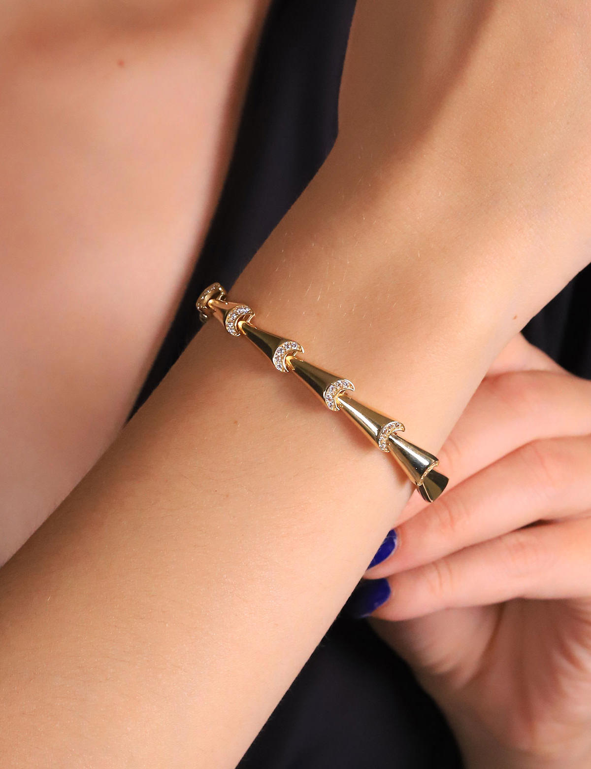 Zarif ve klasik tasarımları seven kadınlar için ideal bir seçenek olan bu bileklik, kadın takı koleksiyonunuzun vazgeçilmez parçası olacak. Özel kalkan desenleri ile modern bir dokunuş sunan 14 ayar altından üretilen bu bileklik, yeşil rengiyle dikkat çekiyor.