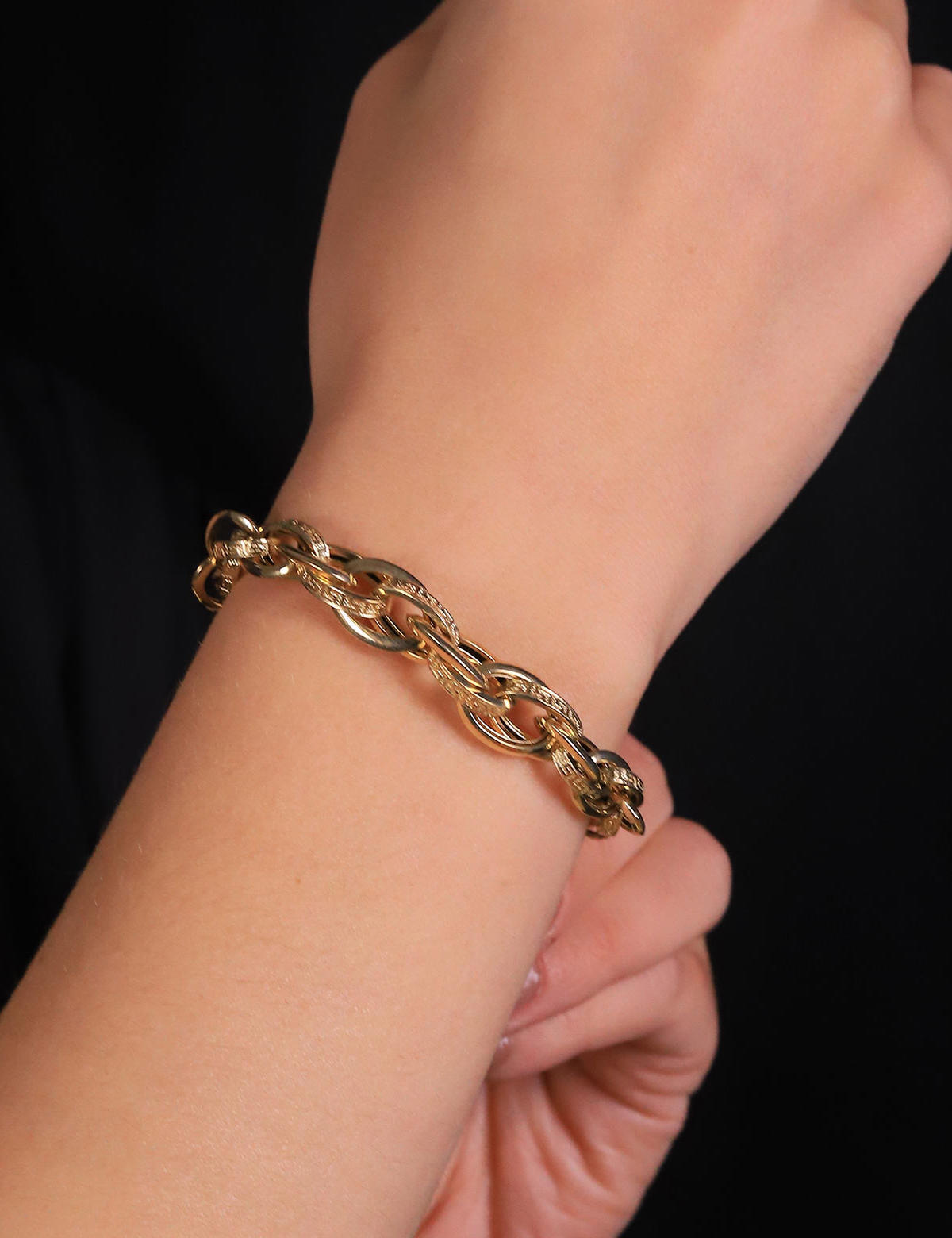 Klasik ve modern çizgileri harmanlayan bu altın bileklik, taşsız yapısıyla sade ama etkileyici bir duruş sergiliyor. Genç kadınların günlük kombinleri için ideal bir seçim olan bu bilezik, stil sahibi görünmek isteyenler için mükemmel.