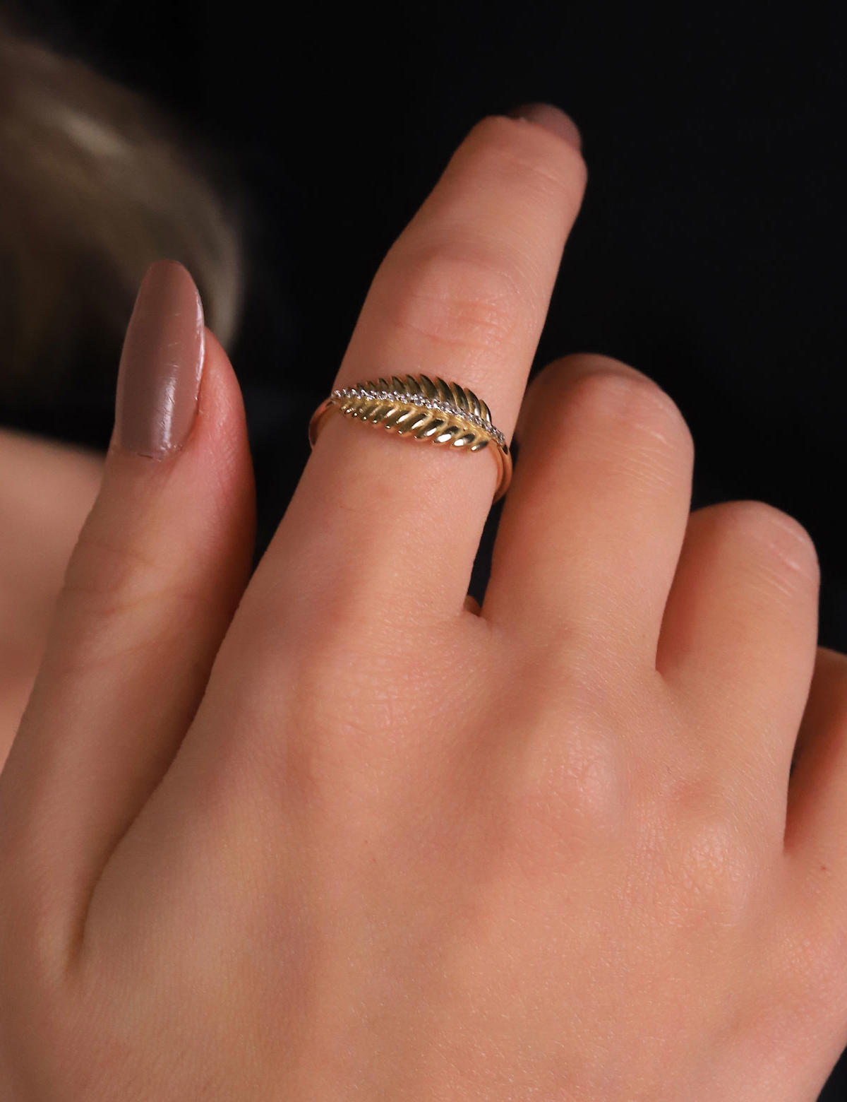 Kadın takılarında zarif ve klasik bir dokunuş arayanlar için ideal olan bu 14 ayar altın yapraklı yüzük, her bakışı üzerinize çekecek. Zirkon taşlarıyla bezeli yüzey, yeşil renk tonuyla birleşerek doğanın en güzel yansımalarını ellerinizde taşımanızı sağlar.