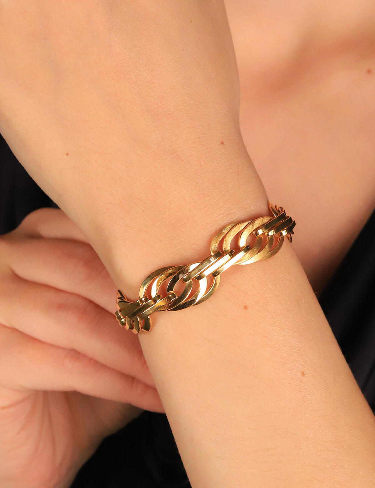 Klasik çizgilerin dışına çıkan bu muhteşem bilezik, minimal dokunuşları severler için ideal bir seçim olacaktır. Geleneksel Türk altın takı üretim teknikleriyle şekillendirilen bilekliğimiz, modası geçmeyecek bir şıklık sunuyor. Zarafeti detaylarda arayanlara hitap eden tasarım, Gülenler Altın güvencesiyle alıcısıyla buluşuyor.