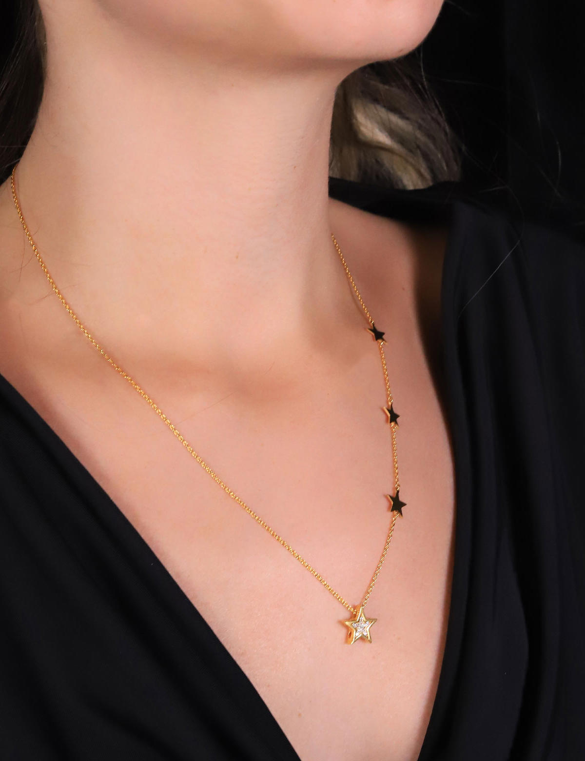 Sarı rengin sıcaklığıyla öne çıkan bu kolyenin yıldız detayları, gündelik yaşantınıza modern ve minimal bir dokunuş katıyor. Genç kadınlar için ideal olan bu parça, zirkon taşlarıyla zarafetini artırıyor.