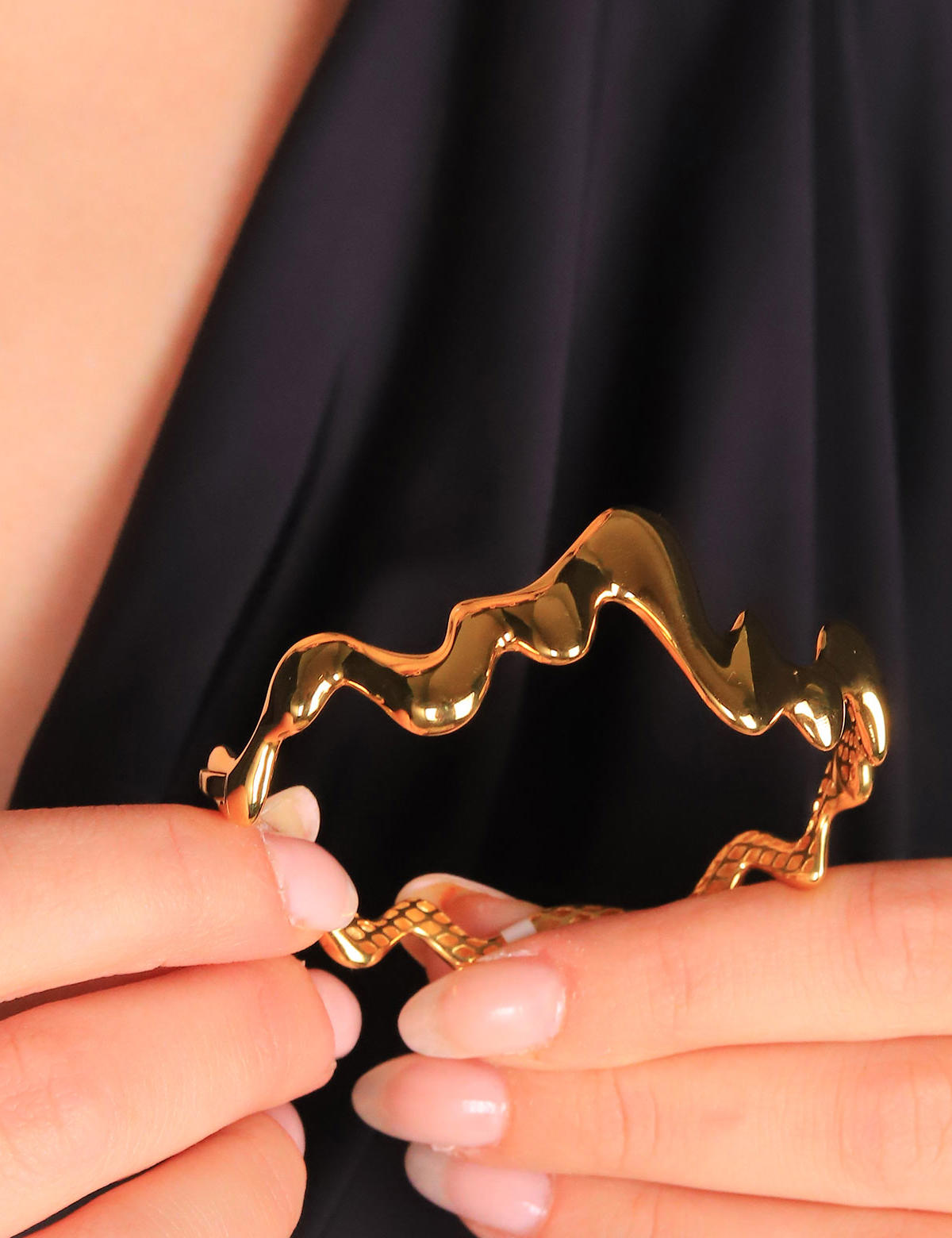 Parlak yüzeyi ile dikkat çeken bu tasarım harikası bileklik, minimal dokunuşlarla klasik şıklığı yeniden tanımlıyor. Taşsız yapısı sayesinde sade ama etkileyici bir görünüm elde etmenizi sağlıyor.